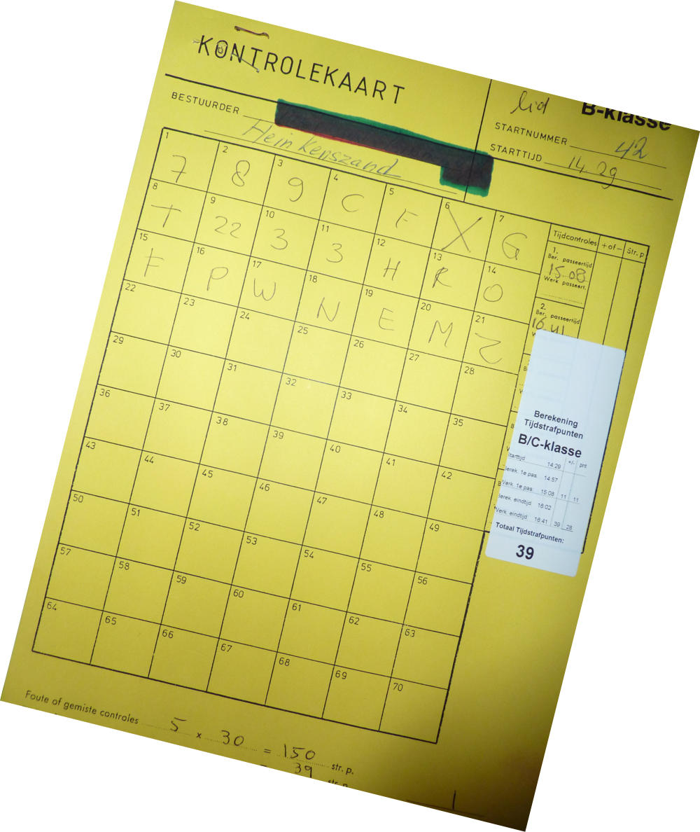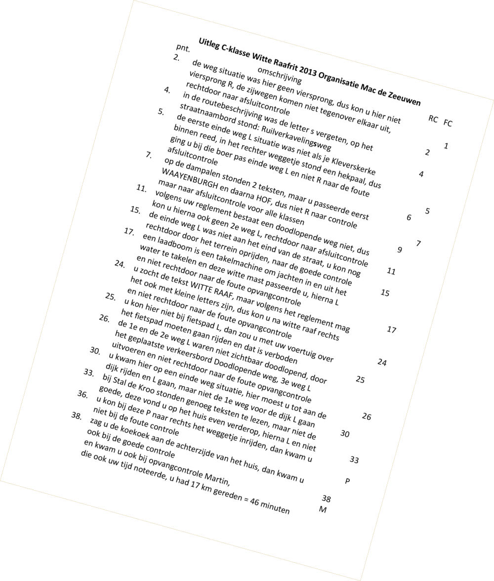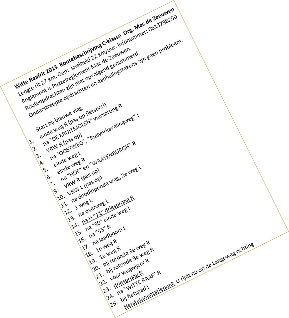 Wat is een puzzelrit?In het kort komt het er op neer dat je aan de hand van een routebeschrijving een afstand van ongeveer 25 kilometer aflegt, zonder daarbij in de foefen te trappen die de uitzetter heeft gebruikt. Hoe doe je dat?Bij de start ontvangt elke deelnemer een routebeschrijving. Aan de hand van genummerde routeopdrachten wordt de route verreden. Je kunt daarbij alleen gebruik maken van alle voor het openbaar rijverkeer (auto en motor) openstaande inrijmogelijkheden. Elke routeopdracht moet leiden tot een richtingverandering. Zolang een opdracht (nog) niet uitvoerbaar is, rijd je rechtdoor, net zo lang tot de opdracht wél uitvoerbaar is; of totdat je wordt opgevangen door een zogenaamde Routecontrole (RC). Bij de start ontvangt iedere deelnemer ook een controlekaart. Langs de route staan routecontroles (RC). En als je deze controles passeert noteer je die op je controlekaart. De routecontroles bestaan uit een oranje bordje met daarop een letter of een getal in de linkerbovenhoek (op de foto letter G). Uitsluitend die letter of getal noteer je in het eerste vrije vakje van je controlekaart.Er zijn ook routecontroles met een extra opdracht. Dit wordt een herstelopdrachtgenoemd. Deze herstelopdrachten dienen om je (weer) op de goede route te brengen of te houden. Herstelopdrachten zijn altijd in “code” en dienen met voorrang uitgevoerd te worden. De toegestane herstelcodes staan in het puzzelreglement, maar een voorbeeld hiervan is:1R = eerste weg rechtsDus eerst de herstelopdracht uitvoeren en dan doorgaan met de route-opdracht.In een routeopdracht zijn uitsluitend de volgende afkortingen toegestaan:RC= onbemande routecontrole L / R= links / rechts VRW = voorrangskruispunt te herkennen aan een verkeersbord of zgn. haaientanden op de weg H= huisnummerbord(je)(VADNA) = Verkeersbord aanduidende doodlopende weg als niet aanwezig beschouwenIn opdrachten worden oriënteringspunten gebruikt, die zich uitsluitend aan de rechterzijde van de route mogen bevinden (of recht voor je).Welke opdrachten kun je krijgen?Bijvoorbeeld: 16. na bank, lantaarnpaal en brug viersprong L. Per opdracht dienen de gevraagde oriënteringspunten in de juiste volgorde voor te komen en zich gehéél na elkaar te bevinden. Dus in het voorbeeld eerst de bank, dan een lantaarnpaal en dan een brug.Oriënteringspunten moeten vaststaande objecten zijn, maar ook afbeeldingen van deze objecten. Ook kan gebruik worden gemaakt van teksten. Als een tekst wordt bedoeld staat deze in de route-opdracht in hoofdletters en tussen aanhalingstekens. De gevraagde tekst dient op één bord te staan, zonder andere tekens of teksten.Bijvoorbeeld: 12. na "BANK" R betekent dat je na de tekst bank naar rechts gaat. 13. na bank L betekent dat je na een bankgebouw (of een zitbank) links gaat. Met één hoofdletter en tussen aanhalingstekens geplaatste delen van een opdracht dien je als straatnaam waar te nemen. Bijvoorbeeld:14. "Tholenstraat" L betekent dat je een weg met de naam “Tholenstraat” links in moet slaan, zichtbaar door het straatnaambord in de linkerweg.Indien een gedeelte van een opdracht onderstreept is, bevat dat deel van de opdracht geen val. Bijvoorbeeld:15. na rood/witte slagboom 1e weg R rood/witte is géén val, slagboom kán een val zijn Een viersprong is een samenkomst van vier wegen. (kruispunt) Een driesprong is een samenkomst van drie wegen, waar de weg waarop men rijdt zich splitst in twee andere wegen (Y-splitsing) Een VRW is een voorrangswegsituatie waar uit een verkeersbord of zgn. haaientanden op de weg) blijkt, dat je voorrang moet verlenen aan het verkeer op de kruisende wegEen einde weg is een situatie waar je alleen links of rechts kunt. (T-splitsing).Een weg kan naar aard worden aangeduid (bijvoorbeeld: asfaltweg of klinkerweg) Een weg kan met naam worden aangeduid (bijvoorbeeld: "Kalverstraat" of "Hofje") Een weg die zichtbaar doodlopend is wordt geacht niet te bestaan.Wat is hier nou zo moeilijk aan?Een voorbeeld van een routebeschrijving: 1. viersprong rechts (Broekstraat) 2. na derde lantaarnpaal klinkerweg rechts 3. tweede vierprong rechts 4. na klinker weg links 5. na flesje bier rechts 1.Ga op een viersprong (samenkomst van vier wegen) rechts. De weg die ingereden wordt, dient de Broekstraat te zijn. 2.Na de derde lantaarnpaal (die volgens het reglement uitsluitend aan de rechterzijde van de weg gezocht moet worden) klinkerweg rechts in gaan, waarbij je moet opletten dat de weg ook echt een klinkerweg is en deze bijvoorbeeld niet voor de helft uit asfalt bestaat (zoals op de foto). 3.Hier moet de navigator of kaartlezer dus opletten. Er staat vierprong in plaats van viersprong. Dat is niet per ongeluk een typefout, maar een test van de uitzetter of iedereen nog oplet. Niemand weet wat een vierprong is, dus rechtdoor blijven rijden tot een routecontrole iedereen weer op de juiste route brengt.4.Ook hier moet de navigator opletten. Er staat wederom bewust een spatie tussen de woorden klinker en weg. Dat betekent dat er op zoek gegaan dient te worden naar een klinker (straatklinker, maar ook de letters A, E, I, O of U) om daarna eerste weg links te gaan. 5.Langs de route komen de deelnemers vast en zeker een leeg bierflesje tegen. Toch niet rechts gaan om de opdracht uit te voeren, omdat er nogal een flink verschil is tussen een bierflesje (leeg) en een flesje bier (vol), dat zullen de liefhebbers bevestigen. Hoe heb je het gedaan?Door middel van bemande- en onbemande routecontroles controleren de uitzetters of de deelnemers de door de uitzetter bedoelde route foutloos rijden. Voor elke gemiste goede controle, alsmede voor elke genoteerde foutcontrole krijgt een deelnemer 30 strafpunten. Voor elke minuut die een deelnemer te vroeg of te laat bij de finish komt, krijgt hij 1 strafpunt Aan het eind van de rit wint de deelnemer die het kleinste aantal strafpunten heeft behaald. Aan het einde van de rit krijg je een uitleg van de rit en kun je zien waar en waarom je verkeerd bent gereden. We wens
